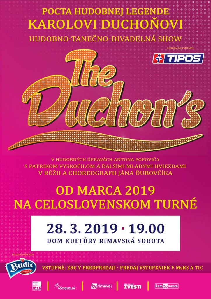 PREDSTAVENIE VYPREDANÉ! Pocta legendárnemu slovenskému spevákovi, 28. 3. 2019 o 19.00 hod. aj v Rimavskej Sobote. Hudobno-tanečná divadelná show, kde zaznejú nesmrteľné hity interpretované Karolom Duchoňom v novom šate, v podaní špičkových mladých slovenských umelcov na čele s Patrikom Vyskočilom, v aranžmánoch Antona Popoviča. V réžii a choreografii Jána Ďurovčíka. Vstupné 28€, predaj vstupeniek v MsKS, TIC a cez Ticketportal. Dĺžka predstavenia: 90 minút.