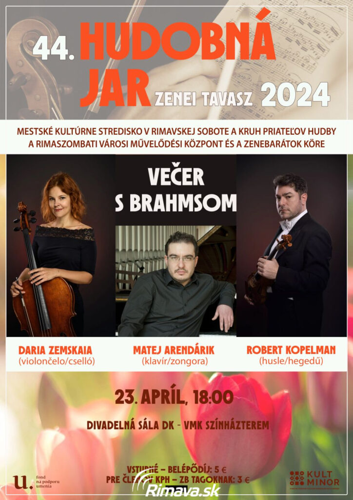 V utorok, 23. 4. 2024 o 18.00 hod. sa v divadelnej sále DK uskutoční ďalší z koncertov 44. ročníka Hudobnej jari. Diela Johannesa Brahmsa nám predvedie trojica umelcov: Robert Kopelman / husle, Daria Zemskaia / violončelo a Matej Arendárik / klavír. Vstupné: 5€ / 3€ pre členov KPH. Koncerty 44. ročníka Hudobnej jari a jesene z verejných zdrojov podporujú