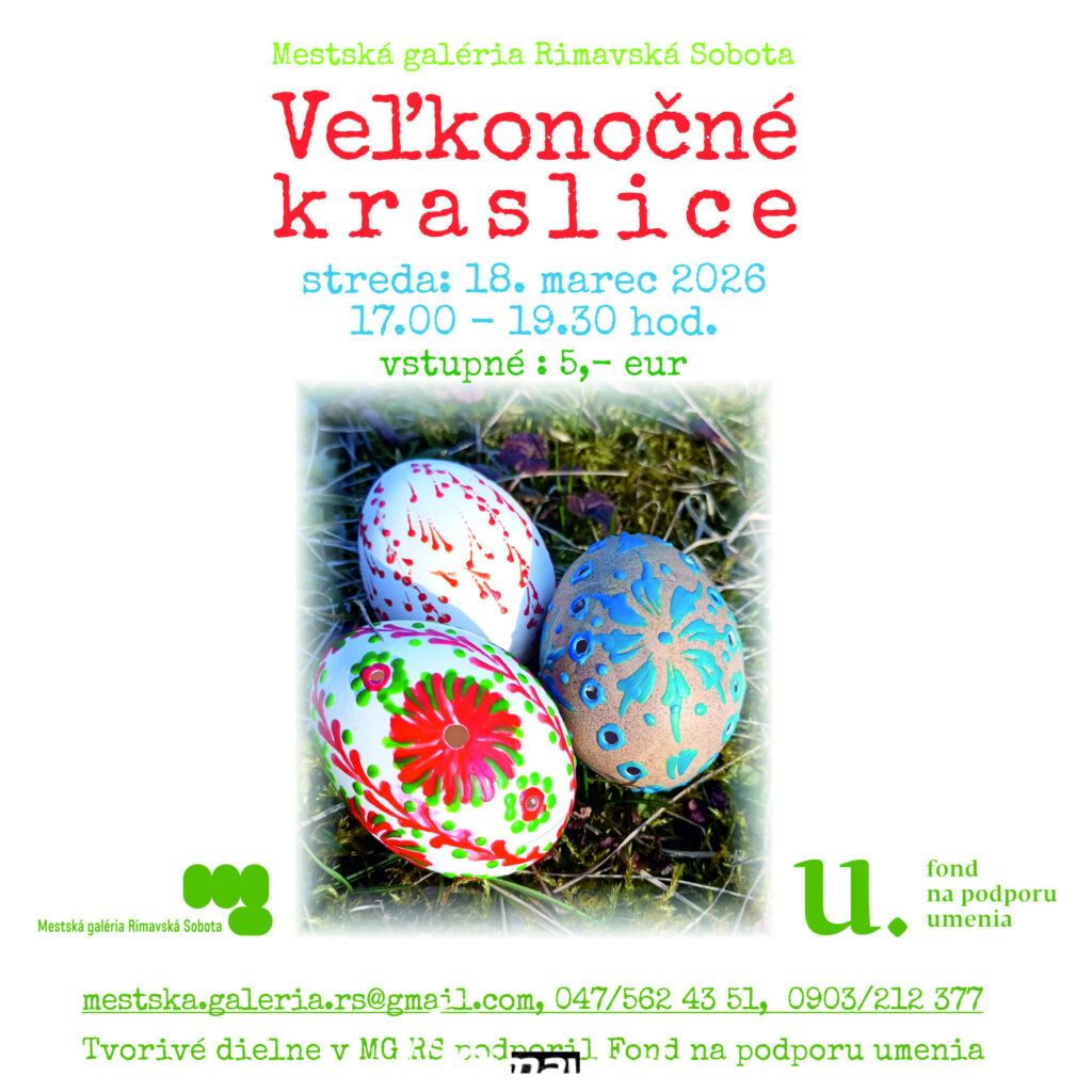 25.mar.2026 - Calendar Kedy: 18. marec 2026 @ 17:00 – 18:30 2026-03-18T17:00:00+01:00 2026-03-18T18:30:00+01:00 Kde: Mestská galéria Rimavská Sobota, Hlavné námestie 5 Rimavská Sobota 97901 Vstupné / Štartovné: 5,- eur Kontakt: Mestská galéria Rimavská Sobota 047/5624351 Email Top akcie Tvorivá dielňa Ďalej...