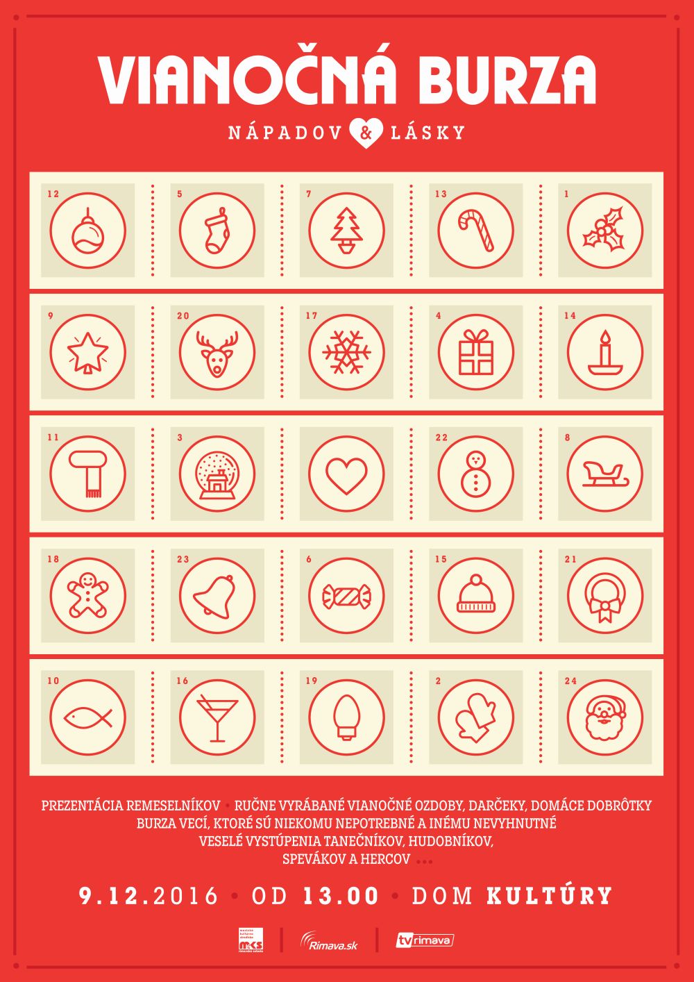 Na jednom mieste sústredené všetko, čo zaženie predsviatočný stres a navodí pravú predvianočnú atmosféru. Burze vianočných nápadov a lásky, ktorá sa po úspešnom prvom ročníku uskutoční opäť v rimavskosobotskom Dome kultúry v piatok, 9.12. 2016 v čase od 13.00 hod. do 19.00 hod. Na podujatí sa budú prezentovať šikovní ľudia, organizácie a inštitúcie z mesta a okolia. Na burze ponúknu rôzne poctivé ručne vyrobené veci, vianočné ozdoby, dekorácie, prírodné mydielka, šperky, rezbárske výrobky, domáce dobroty, perníky, či prírodné produkty z oblasti včelárstva a pod. Priebeh akcie spríjemní kultúrny program tu pôsobiacich kolektívov, folklórnych súborov, speváckych zborov, divadelníkov i tanečníkov, ktorí sa po sebe vystriedajú na pódiu priamo v priestore foyer (vchod od Kauflandu), kde bude celé dianie sústredené. Súčasťou bude aj bazár najrôznejších vecí, kníh, hračiek, oblečenia, čohokoľvek, čo bude možné priniesť a vymeniť za niečo iné v približne rovnakej hodnote. Zvyšné veci budú odovzdané v Krízovom centre, Detských domovoch a ľuďom v hmotnej núdzi. Možno práve vaše veci, ktoré už nepotrebujete, potešia iných. Podujatie organizujeme pre všetkých ľudí dobrej vôle a týchto na podujatie i pozývame. Pripájame presný harmonogram vystúpení, aby ste mohli prísť podporiť práve tých, ktorí sú vám najmilší. Každý, kto má záujem prísť ponúknuť svoje originálne výtvory, alebo priniesť nepotrebné veci do bazáru nás môže kontaktovať na tel. 047 5621550.
