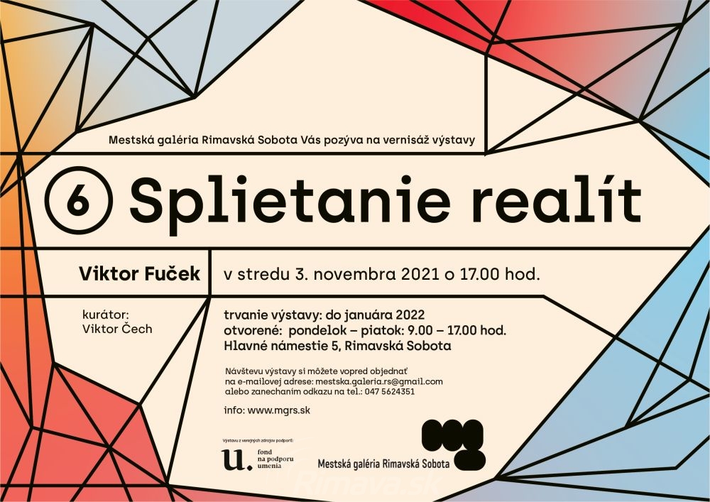 Mestská galéria Rimavská Sobota Vás pozýva v stredu, 3. 11. o 17.00 hod. na vernisáž výstavy Viktor Fuček, Splietanie realít. Hlavným leitmotívom výstavy je „Hra s motúzmi – StringFigures", ktorú Viktor Fuček (1977) rozplieta rôznymi interpretačnými cestami. Myšlienkový rámec, ako aj použitý materiál spadá do kategórie umeleckej práce s niťami, tkaním a pletením, ako aj s textilom. Výstava potrvá do januára 2022. Otvorené: po – pi: 9.00 – 17.00 hod. Výstavy z verejných zdrojov podporil Fond na podporu umenia.