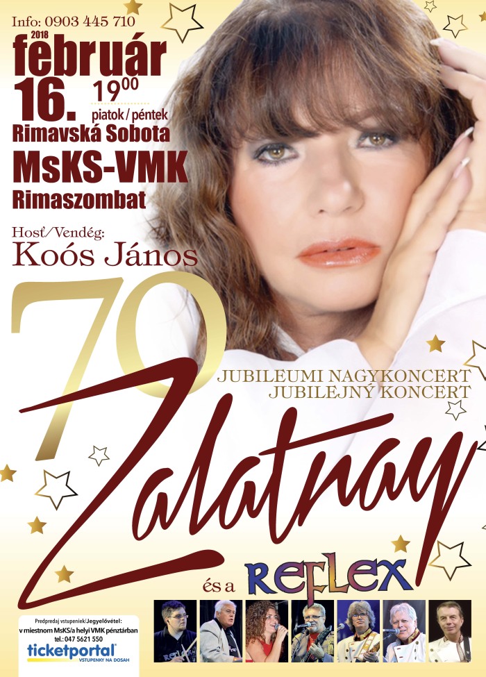Jubilejný koncert obľúbenej maďarskej speváčky Sarolta Zalatnay. Hosťom večera bude Koós János.