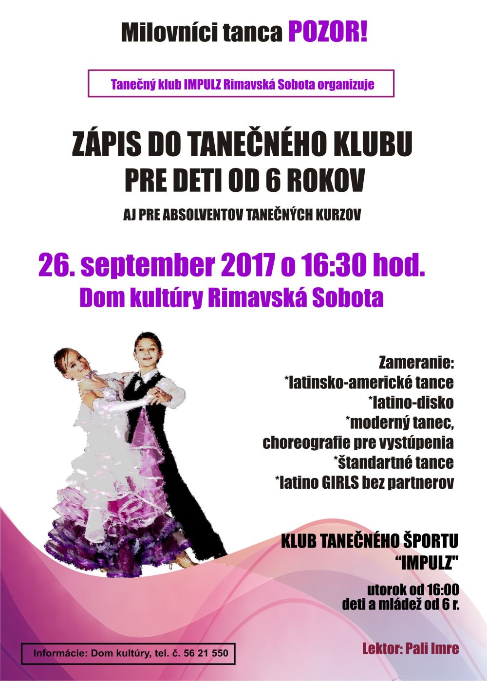 Máte doma dieťa, ktoré neobsedí a rado tancuje? Neváhajte a prihláste ho do nášho tanečného klubu Impulz. Krúžok je venovaný deťom od 6 rokov, ale je vhodný aj pre absolventov školských tanečných kurzov. Zápis bude v utorok, 26. 9. o 16.30 hod. v Dome kultúry (vchod od kruháča). Stretávajú sa každý utorok od 16.00 hod. Lektorom je skúsený tanečník Pali Imre. Pod jeho vedením sa deti naučia latinsko-americké tance, latino-disco, moderný tanec, štandardné tance a rôzne choreografie. Dievčatám sa určite zapáči aj latino girls bez partnerov. Bližšie informácie na tel. 5621550.