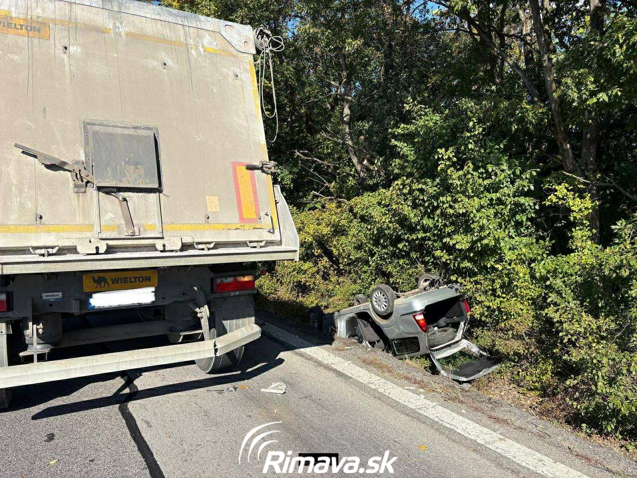 Podľa našich informácií išli za sebou dva idúce kamióny. Prvý z nich odbočoval na parkovisko, druhý zabrzdil a osobné auto idúce za nimi nestihlo včas zabrzdiť a narazilo do zadnej časti kamióna. Osobné auto sa následne prevrátilo na strechu mimo vozovky.