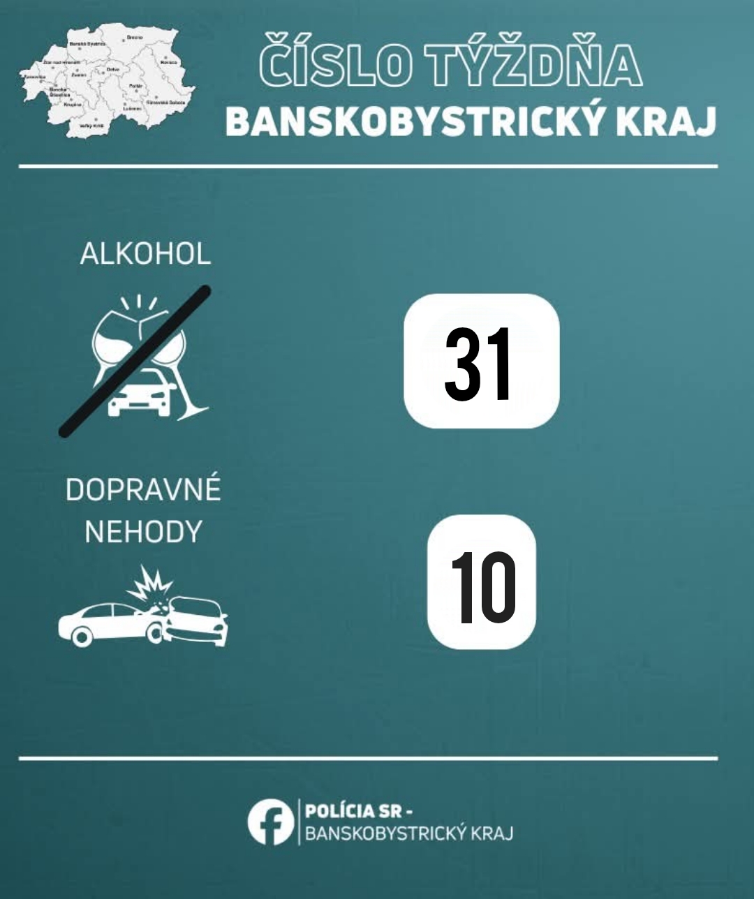 Polícia informovala, že počas uplynulého 15. týždňa zaznamenali na cestách Banskobystrického kraja celkovo 10 dopravných nehôd, pri ktorých utrpela jedna osoba ľahké zranenia. Zároveň odhalili 31 vodičov jazdiacich pod vplyvom alkoholu, z toho 19 boli vodiči nemotorových vozidiel. Okrem toho 11 vodičov jazdilo pod vplyvom inej návykovej látky.