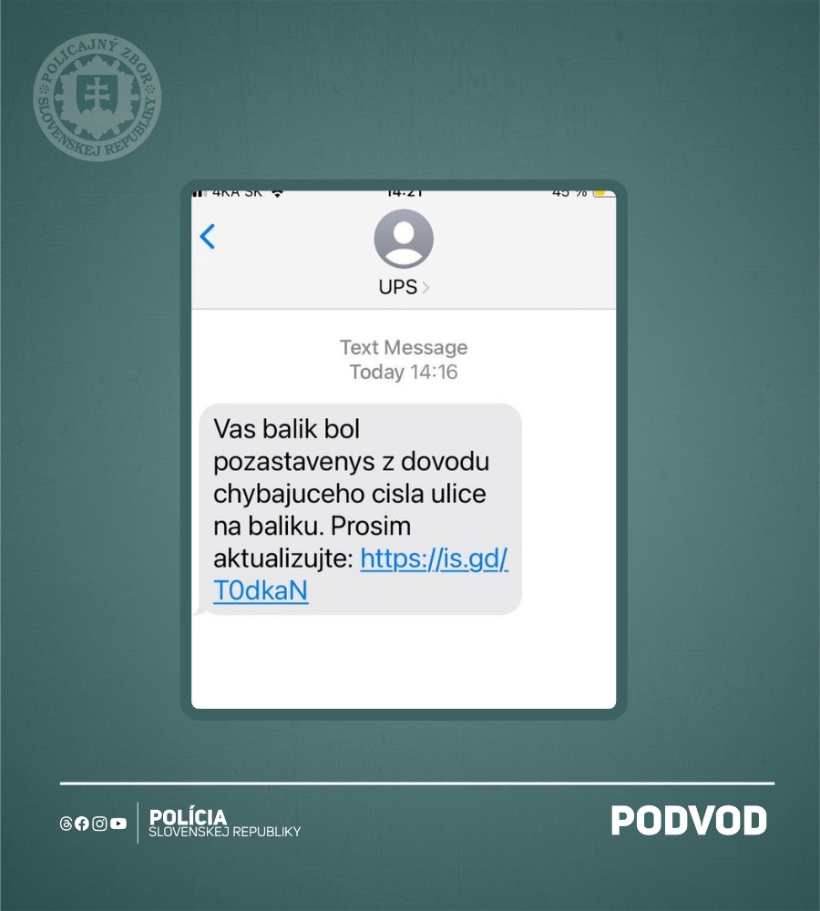 SLOVENSKO - Polícia SR upozorňuje občanov na masovo sa šíriacu podvodnú SMS správu týkajúcu sa nedoručenia zásielky, ktorá už spôsobila problémy desiatkam ľudí. O tomto nebezpečenstve informovali policajti prostredníctvom svojej sociálnej siete.