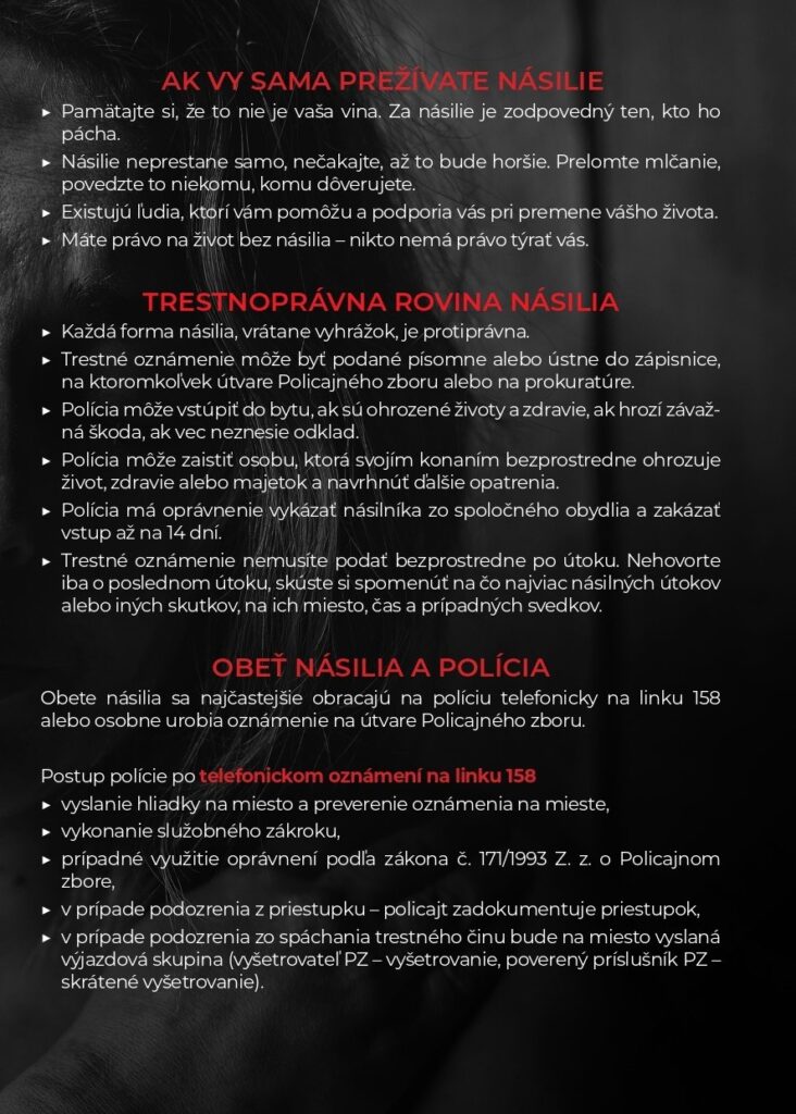 Vyhľadajte pomoc, napríklad na bezplatnej nonstop linke pre ženy zažívajúce násilie 0800 212 212, kde vám poskytnú poskytujú poradenstvo respektíve krízovú pomoc a všetky ďalšie potrebné informácie.