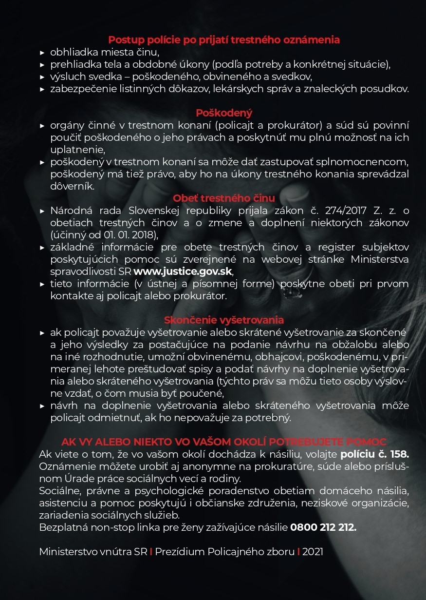 V prípade, ak sú ohrozené životy a zdravie, ak hrozí závažná škoda a vec neznesie odklad, volajte linku tiesňového volania na čísle 112 alebo priamo políciu na čísle 158.