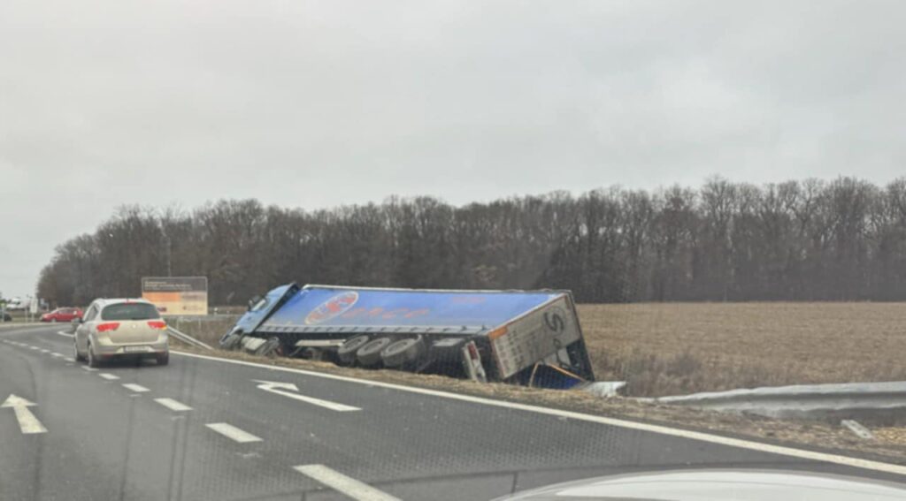 Vodiči by však mali zvýšiť opatrnosť – o niekoľko metrov ďalej v smere na diaľnicu sa v priekope nachádza prevrátený kamión.