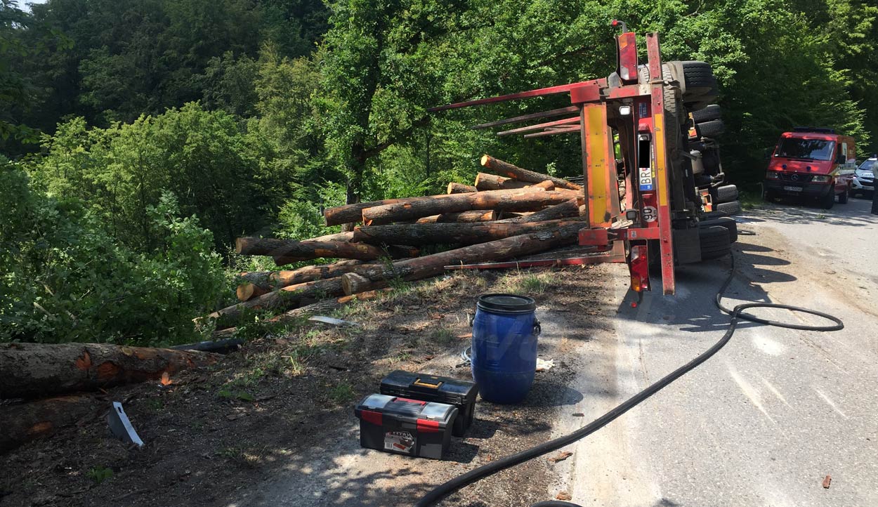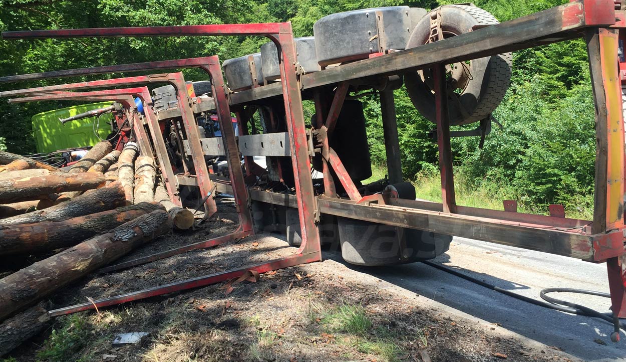 DOPLNENÉ: V zákrutách pri Brezine sa prevrátil kamión s drevom