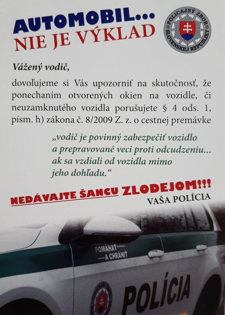 A taktiež pripomíname, že „Auto nie je výklad“. Vždy, keď opúšťate svoje vozidlo, napríklad zaparkované pred nákupným strediskom, majte na pamäti, že príležitosť robí zlodeja. Preto vo vozidle nikdy nenechávajte na viditeľnom mieste žiadne predmety – veľkonočný nákup v taške (ten odložte do batožinového priestoru) a už vôbec nie kabelky, mobilné telefóny, peňaženky ani iné cennosti (tie si vždy zoberte so sebou). Pri opustení vozidla taktiež nezabudnite skontrolovať, či nemáte niekde pootvorené okno a fyzicky si skontrolovať, či je vozidlo riadne uzamknuté.