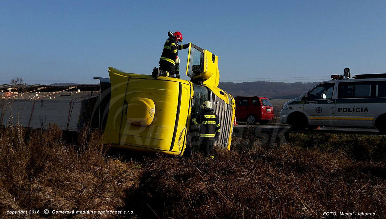 Za Veľkými Teriakovcami sa prevrátil kamión s drevom, vodiča previezli do nemocniceZa obcou Veľké Teriakovce, v časti Krásná, sa dopoludnia prevrátil kamión naložený drevom smerujúci do Rimavskej Soboty. Zišiel na krajnicu a prevrátil sa do priekopy, v súčasnosti nezasahuje do cesty. Jeho vodiča previezli záchranári do rimavskosobotskej nemocnice. Podľa informácií z miesta nehody sa vodič údajne vyhýbal oprotiidúcemu vozidlu. Na mieste premávku riadila polícia, privolaní boli aj štyria hasiči s vozidlom.