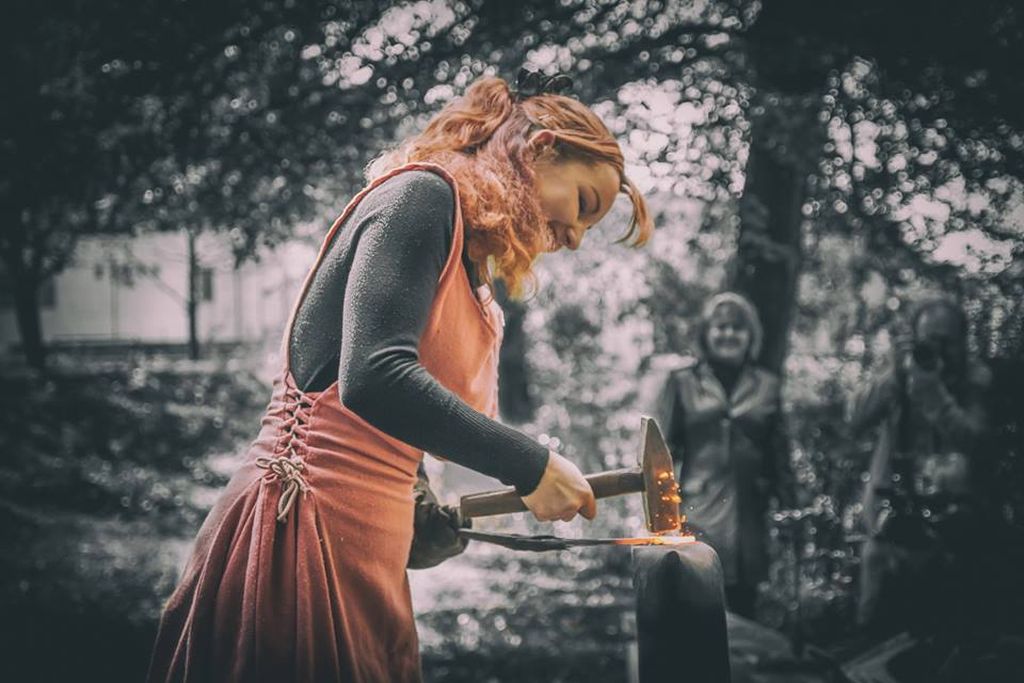 A čo potrebuje kováč? Vyhňu, nákovu, kladivá a pár klieští. To je základné náradie. Potom sú rôzne buchare, samozrejme nejaké flexky na rezanie, zváračka. Teraz som k narodeninám dostala obrovský tlakový buchar, tak mám z neho veľkú radosť.