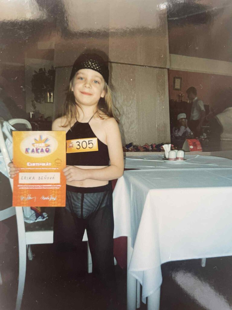 Lásku k pohybu v nej prebudila vychovávateľka zo základnej školy – Miriam Farkašová, dnes už Kobelovská. „Ona bola ten chtíč. Vďaka nej som pochopila, že tanec je moja cesta.“ Prvým väčším krokom bolo vystúpenie v detskej televíznej relácii KakaoStar. „Nikdy som o tom nehovorila. Ale bol to moment, ktorý mi ostal v srdci. Bolo to vystúpenie pred ľuďmi, v telke… Zrazu som cítila, že tanec je niečo, čo ma úplne napĺňa.“