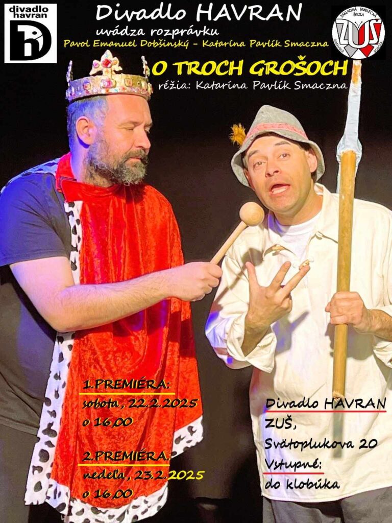 Vstupné na predstavenie O troch grošoch bude formou dobrovoľného príspevku do klobúka. Divadlo Havran srdečne pozýva malých aj veľkých divákov, aby sa prišli nechať uniesť čarovným príbehom.