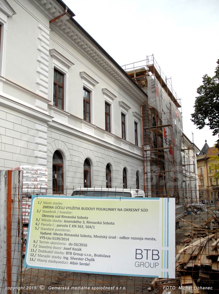 Historická budova, bývalá súdna sedria na Námestí M. Tompu v Rimavskej Sobote, dostala novú fasádu. Podľa pracovníkov je budova z vonku po približne ôsmich mesiacoch takmer hotová. Celá rekonštrukcia stavby, ktorá je financovaná štátom v sume takmer 5 mil. eur, by mala byť ukončená v marci. Potom by mala slúžiť ako nové sídlo okresného súdu.