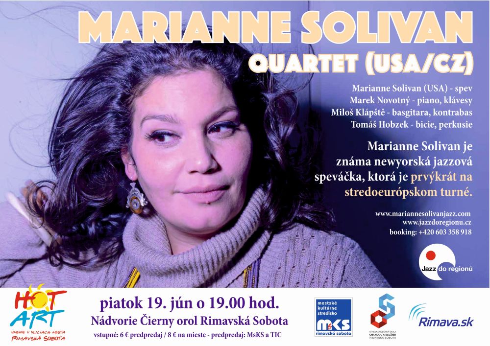 Kultúrne leto HOT ART, ktorého organizátori aj tento rok pripravili bohatý a rozmanitý program, začína už v piatok, 19. júna o 19.00 hod. Na nádvorí Čierny orol vystúpi už tradične medzinárodná jazzová formácia, tentokrát sa rimavskosobotským divákom predstaví Marianne Solivan Quartet. Zoskupenie okolo výnimočnej newyorskej vokalistky a skladateľky Marianne Solivan, v zložení Marek Novotný piano, Miloš Klápště basgitara, kontrabas, Tomáš Hobzek bicie bude zaručeným zážitkom. Predpredaj lístkov je v Mestskom kultúrnom stredisku a Turistickom informačnom stredisku. Vstupné je 6€ v predpredaji / 8€ na mieste. Zaručene budeme v úžase počúvať :-), odkazujú organizátori z MsKS, ktoré organizuje HOT ART už po siedmykrát.