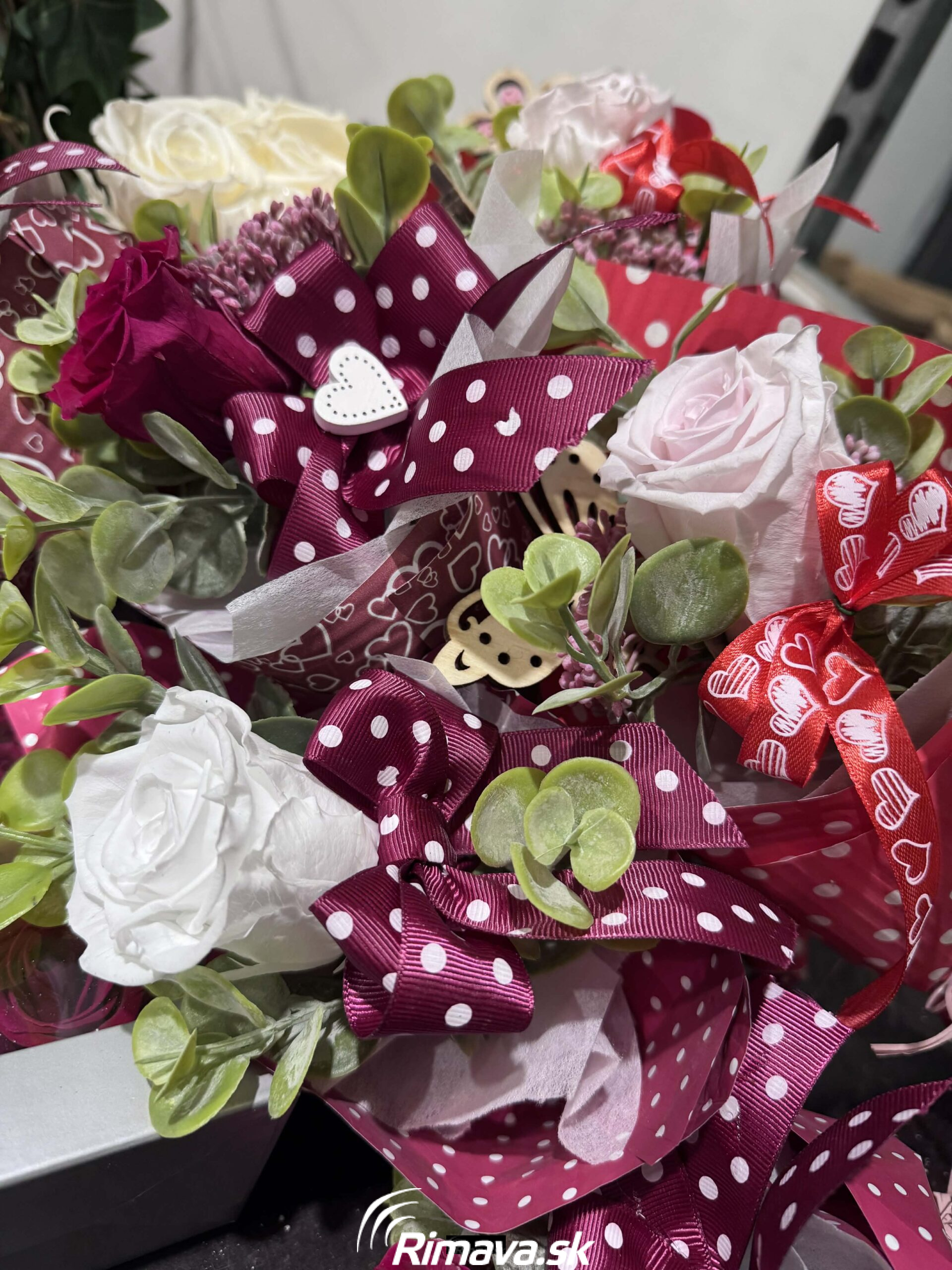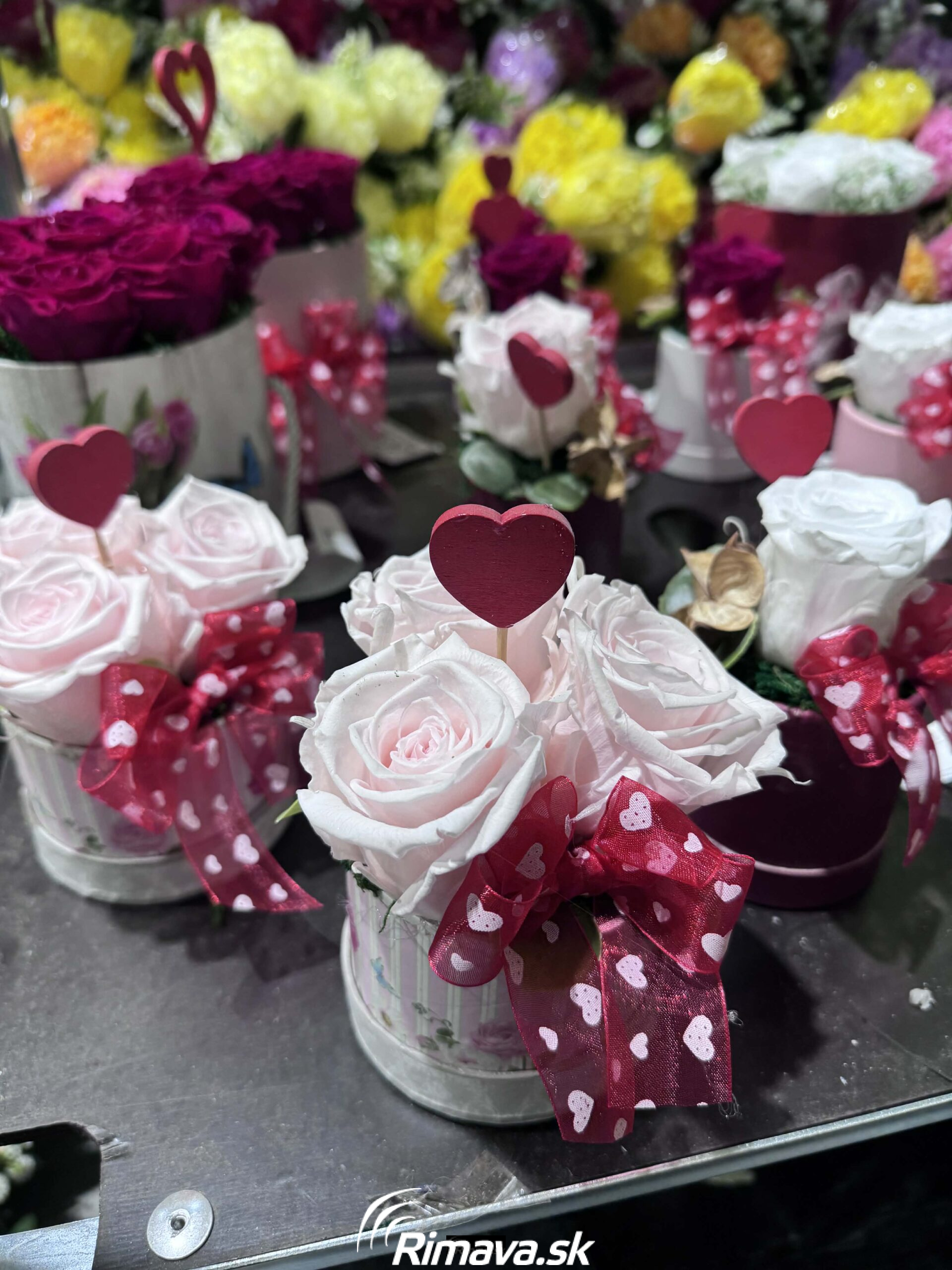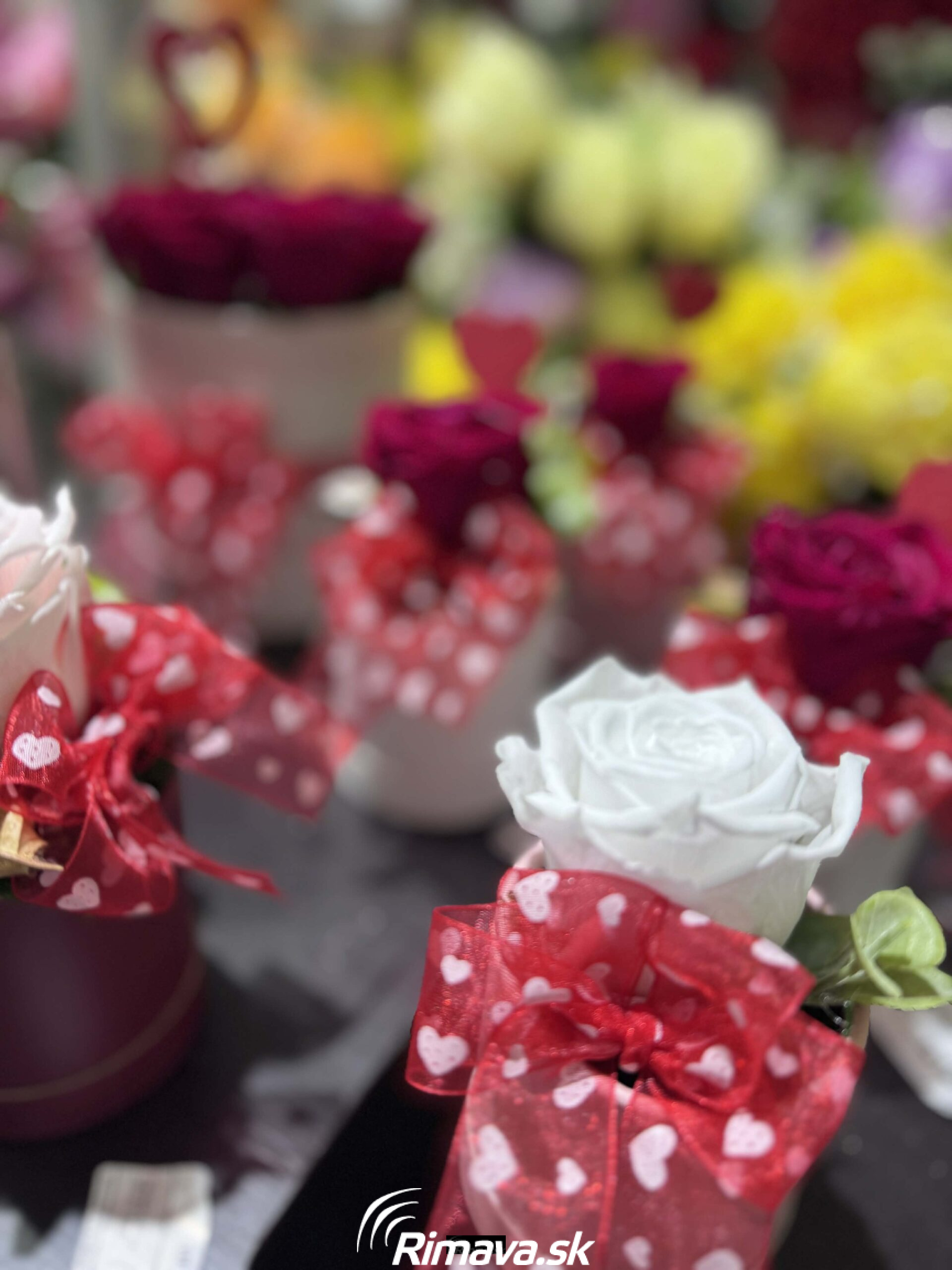 Okrem čerstvých kvetov majú v kvetinárstve pripravené aj rôzne aranžmány, ale aj čoraz obľúbenejšie preparované, tzv. večné ruže. Tie si zachovávajú svoj vzhľad dlhé roky a sú obľúbeným darčekom pri výnimočných príležitostiach. „Máme ich samostatne, ale aj vo forme ružových macíkov. Sú v dvoch veľkostiach a čoskoro pribudnú aj srdiečka z ruží,“ približuje ponuku Matej Lajgút.