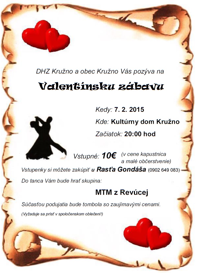 v sobotu, 7. februára - Valentínska zábava, Kultúrny dom Kružno