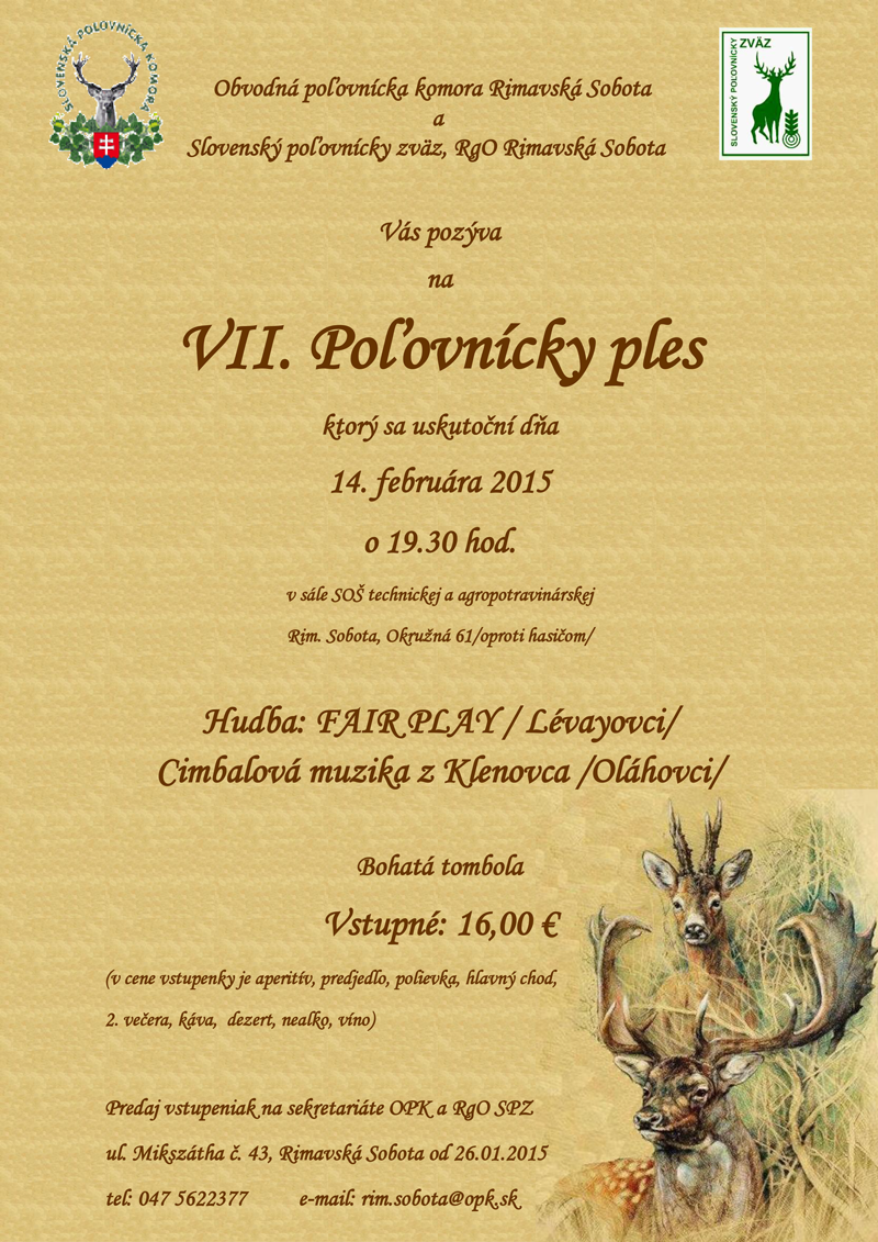 v sobotu, 14. februára, VII. Poľovnícky ples, sála SOŠ technickej a agropotravinárskej, Okružná ulica, Rimavská Sobota