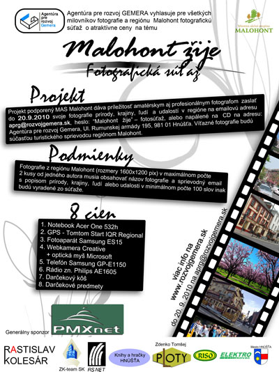 Súťaž pre všetkých milovníkov fotografie a regiónu Malohont vyhlásila Agentúra pre rozvoj Gemera. Ako pre Rimava.sk uviedla riaditeľka agentúry JUDr. Monika Vaškovičová, hlavným poslaním súťaže je pokračovať v začatej propagačnej kampani s názvom Malohont žije. „Jej cieľom je prebudiť hrdosť na krásy a zaujímavosti regiónu a motivovať súťažiacich k lepšiemu poznaniu potenciálu regiónu Malohont,“ uviedla Vaškovičová.