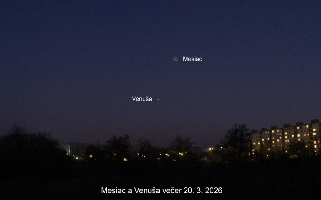 Pozrime si tenký kosáčik Mesiaca, pod ním jagavú Venušu a vysoko nad obzorom v súhvezdí Blížencov aj jasný Jupiter. Na miestach bez svetelného znečistenia je možné zbadať nad západným obzorom slabý kužeľ svetla – zodiakálne.