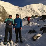 Ale vrátim sa na chvíľu k samotnému stanovému mestečku, pri ktorom stojí plne vybavená chata s možnosťou prespania, teplého jedla, wc - šlapacie, nečakajte žiadny luxus 🙂 Možnosť si navariť v chate, samozrejme na vlastnom plynovom variči. Keď sme s Lukášom našli vhodné a bezpečné miesto na postavenie stanu, spustila sa snehová metelica, takže sme ho postavili bleskovo ako úplní profíci 🙂 Niečo sme zjedli a ľahli si ako tak spať, aspoň sa pokúsiť, budík na pol jednu v noci a podľa počasia sa uvidí. Zobudili sme sa v snehovom iglu a kedže vyhliadky, že tak skoro prestane snežiť neboli optimistické, spali sme ďalej. Celý deň sme trávili fotením krásneho okolia obrovských ľadovcov, ktoré keď človek vidí naživo, stráca slová. Ďalší deň hlásili pozitívnejšiu predpoveď, takže sme si nachystali všetko potrebné na výstup, pozitívne bolo, že batohy stratili dosť na váhe, na vrchol sme si brali len potrebné veci, jedlo a vodu. Ale samozrejme vo výstroji nesmeli chýbať mačky, sedací úväz, karabíny, cepín, prilba, lano, čelovka (na nočné lezenie steny), slnečné okuliare (bez nich by sme na ľadovci riskovali snežnú slepotu) a zvyšok už tvorilo oblečenie zodpovedajúce daným podmienkam, ktoré ako sa potom ukázalo, boli náročnejšie.