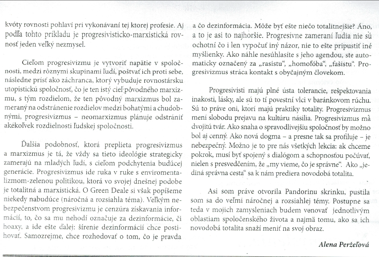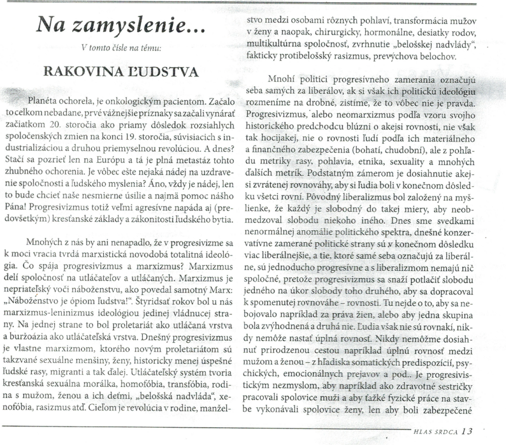 Hoci cirkevné médiá sa prirodzene venujú spoločenským otázkam, očakáva sa, že budú robiť rozdiel medzi kritickým názorom a otvorenou politickou propagandou či dehonestovaním skupín ľudí. V tomto prípade však oba texty prekračujú práve tieto hranice. V článku Aleny Perželovej sa nachádzajú formulácie ako na príklad: