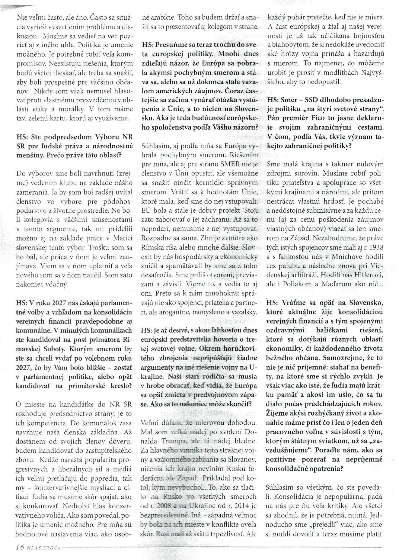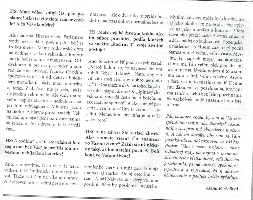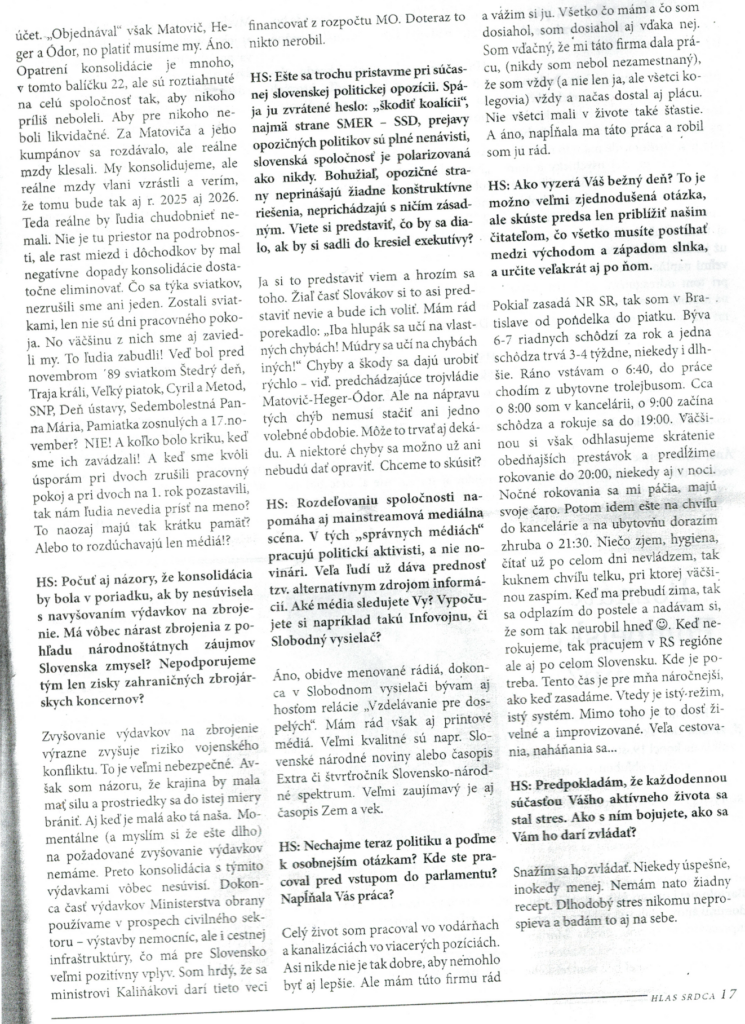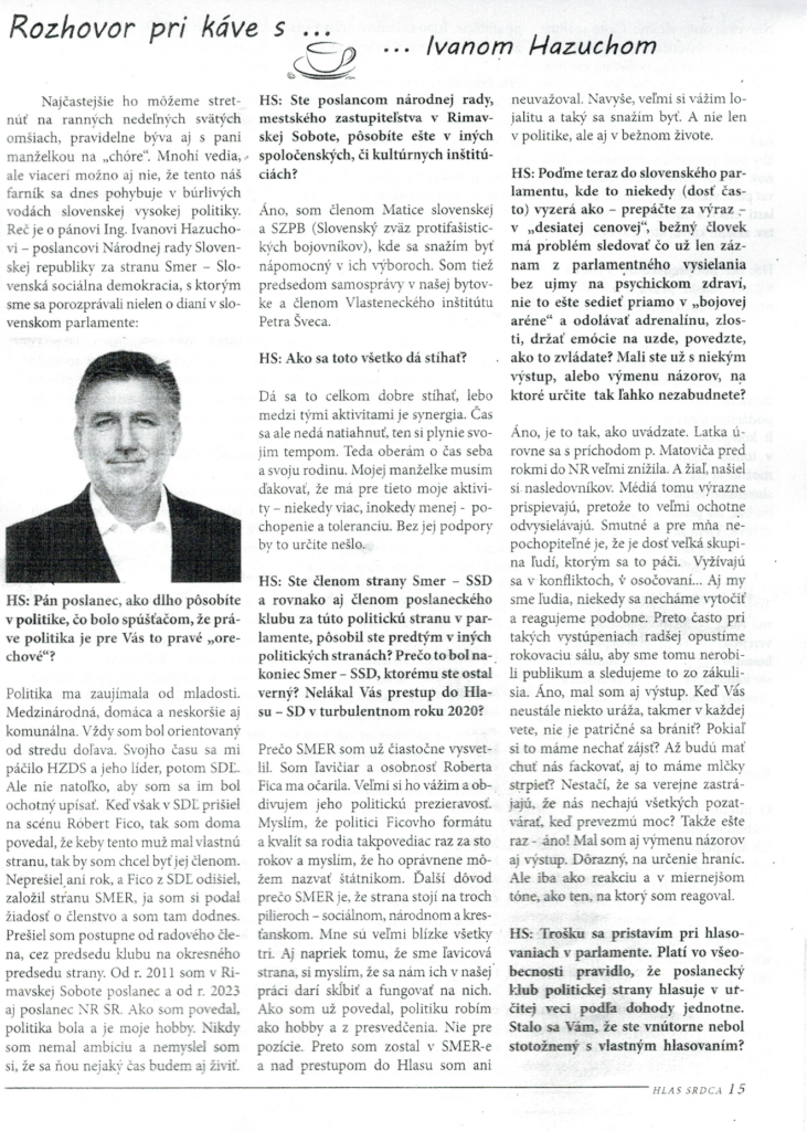 Rozsiahly rozhovor s poslancom Hazuchom obsahuje množstvo politických tvrdení, ktoré neprešli žiadnou redakčnou oponentúrou. Medzi najvyhrotenejšie patria: