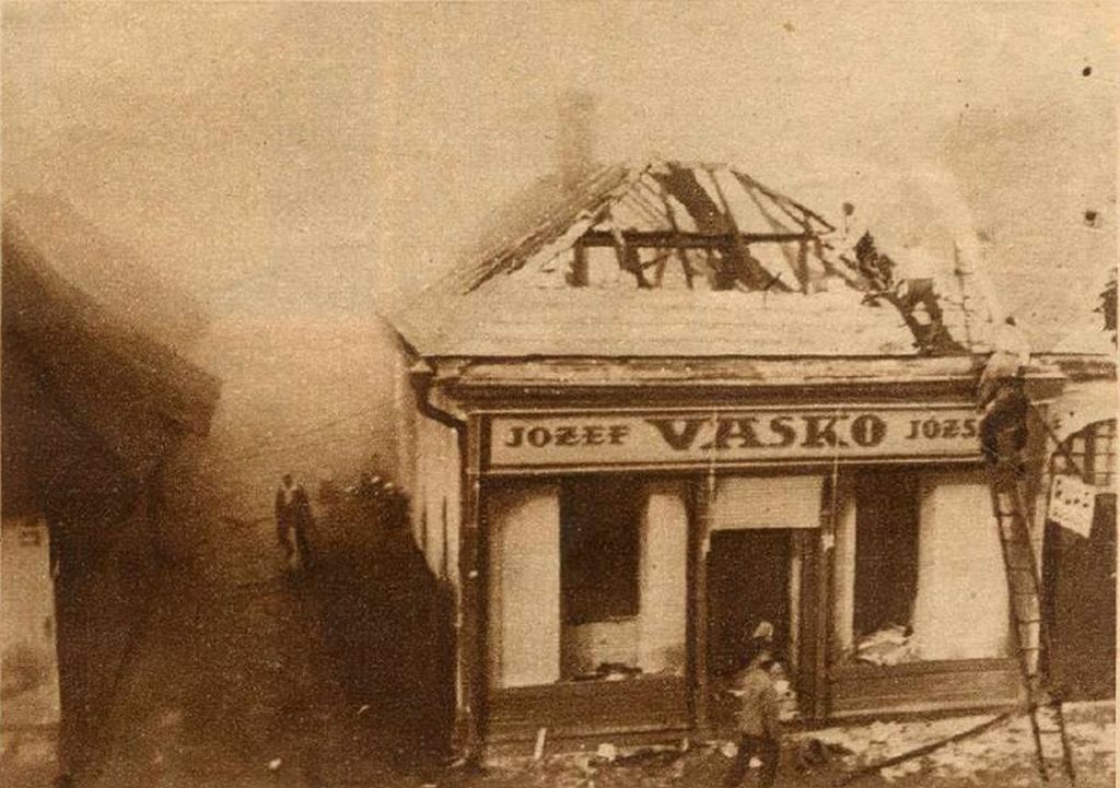 Chvíľu trvalo, pokiaľ jednotlivo prichádzali na miesto požiaru, ale to už horeli strechy domov rodín Czagány a Szőllossy. Časť z nich okamžite začala s hasením, ale oheň sa rýchlo šíril, strešné krytiny boli zo šindľov a ten horel ako papier. Druhá časť hasičov vylomila rolety na predajni Vaskóa, museli zároveň porozbíjať veľké zrkadlá, ktoré boli vo vnútri a začali von vynášať tovar, aby zabránili ešte väčším škodám. Von sa začalo vynášať aj zariadenie z ďalších dvoch domov, ale to už na pomoc prišli žandári a aj vojaci z miestnej posádky. Významnou posilou sa stal hasičský zbor z tabakovej továrne a po zhruba jeden a pol hodine spoločného boja sa im podarilo požiar dostať pod kontrolu.