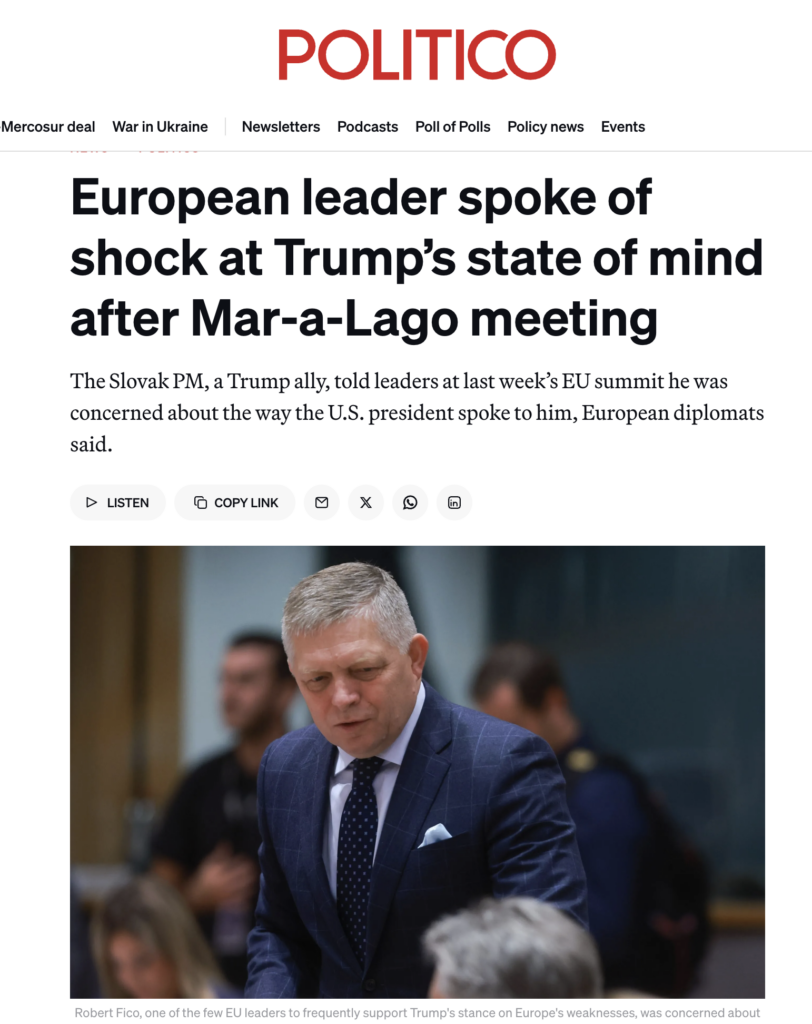 Niečo sa deje. Len krátko po návšteve Roberta Fica v USA a následnom presune do Bruselu sa objavili zahraničné titulky hovoriace o premiérovom „šoku“ z Donalda Trumpa. Fico sa síce voči nim ohradil, no pochybnosti nezmizli. Skôr naopak – začali sa vrstviť ďalšie signály, že nervozita nie je len mediálnym výmyslom. Premiér sa dôrazne ohradil.