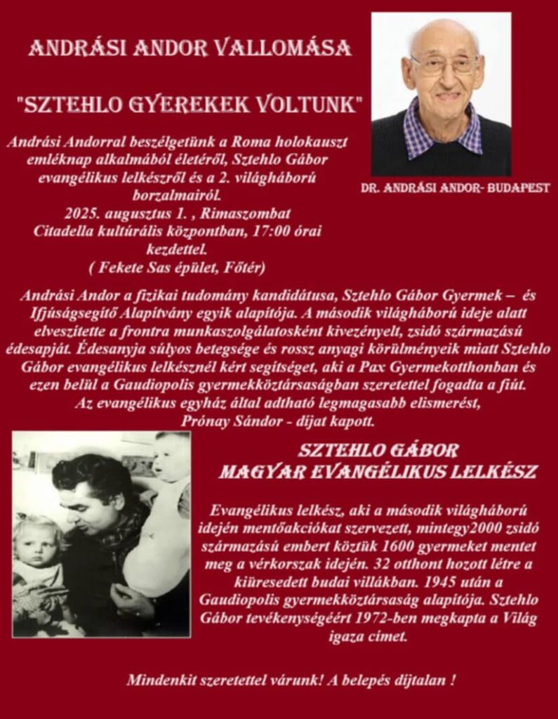 Rimavská Sobota si aj tento rok pripomenie tragické udalosti druhej svetovej vojny. V piatok 1. augusta sa uskutoční diskusia „Boli sme Sztehlove deti“ (v maďarskom jazyku), venovaná luteránskemu pastorovi Gáborovi Sztehlovi, ktorý zachránil 1 600 židovských detí pred prenasledovaním.
