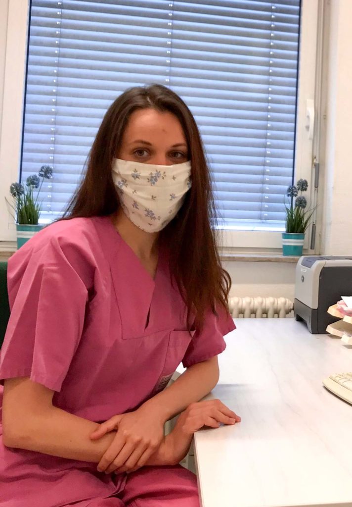 Domnievam sa, že nemocnice v Nemecku celkovo nemajú problém s ochrannými prostriedkami. Hneď po tom, ako bola vyhlásená pandémia, Nemecko zastavilo vývoz všetkých zdravotníckych pomôcok a materiálov do zahraničia. Máme dosť všetkého. Pred vstupom do izby pre pacientov s COVID – 19 si dávame jednorazové plášte, čiapku, rúška s filtrom a okuliare.