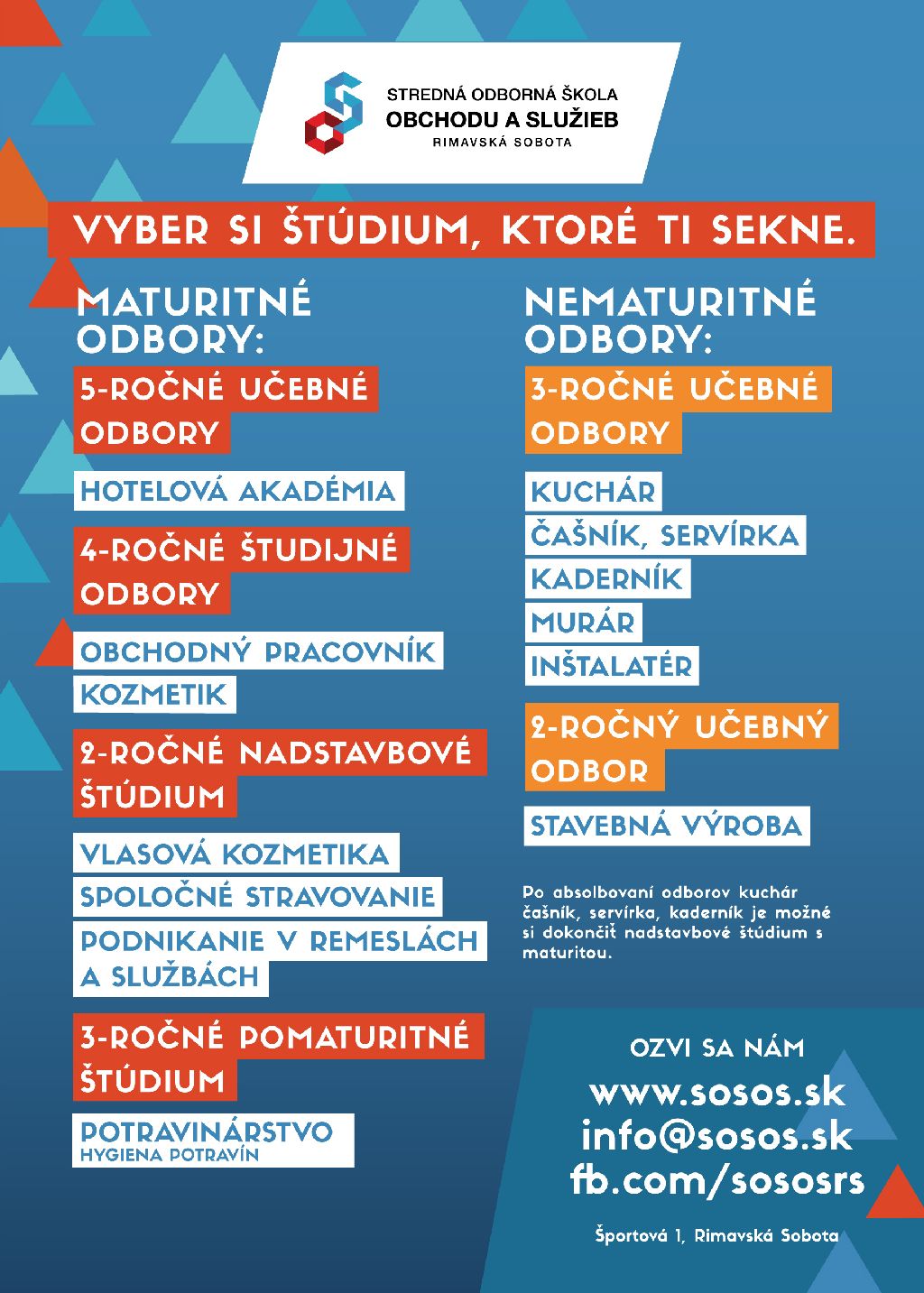 Pomaly ale isto sa blíži čas, kedy si budú deviataci vyberať strednú školu. Dôležité rozhodnutie, ktoré ovplyvní nielen ich najbližšie roky života, by mali mať dobre premyslené. Čo ponúka Stredná odborná škola obchodu a služieb v Rimavskej Sobote?