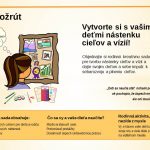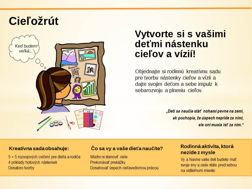 A čo je Cieľožrút? Ako Andrea vysvetlila, je to rodinná kreatívna sada pre tvorbu nástenky cieľov a vízii, ktorá obsahuje 5 + 5 rozvojových cvičení pre dieťa a rodiča, 4 príklady hotových násteniek a desatoro tvorby. Je určená najmä pre deti vo veku 8-12 rokov a ich rodičov. „Nejedná sa o nástenky ako také, ale cvičenia v tematickej grafike, ktoré si rodič a dieťa spoločne vypĺňajú a môžu si ich zavesiť či prilepiť úplne hocikde – od obyčajnej nástenky cez stôl až po dvere od toalety. A teda, budú mať svoje sny a ciele stále pred sebou. Deti vďaka Cieľožrútovi pochopia, ako byť zdravo cieľavedomé, čo to znamená „stáť nohami pevne na zemi“ a prestanú rozmýšľali tak, že veci vybaví alebo kúpi mamka či ocko,“ vysvetlila a zároveň dodala, že rodičia sa zase aspoň na chvíľku budú môcť stať ich „superhrdinami“ a sprevádzať ich cestou stanovovania si cieľov, prekonávania prekážok, namáhania sa a dosahovania úspechu cieľavedomou prácou.