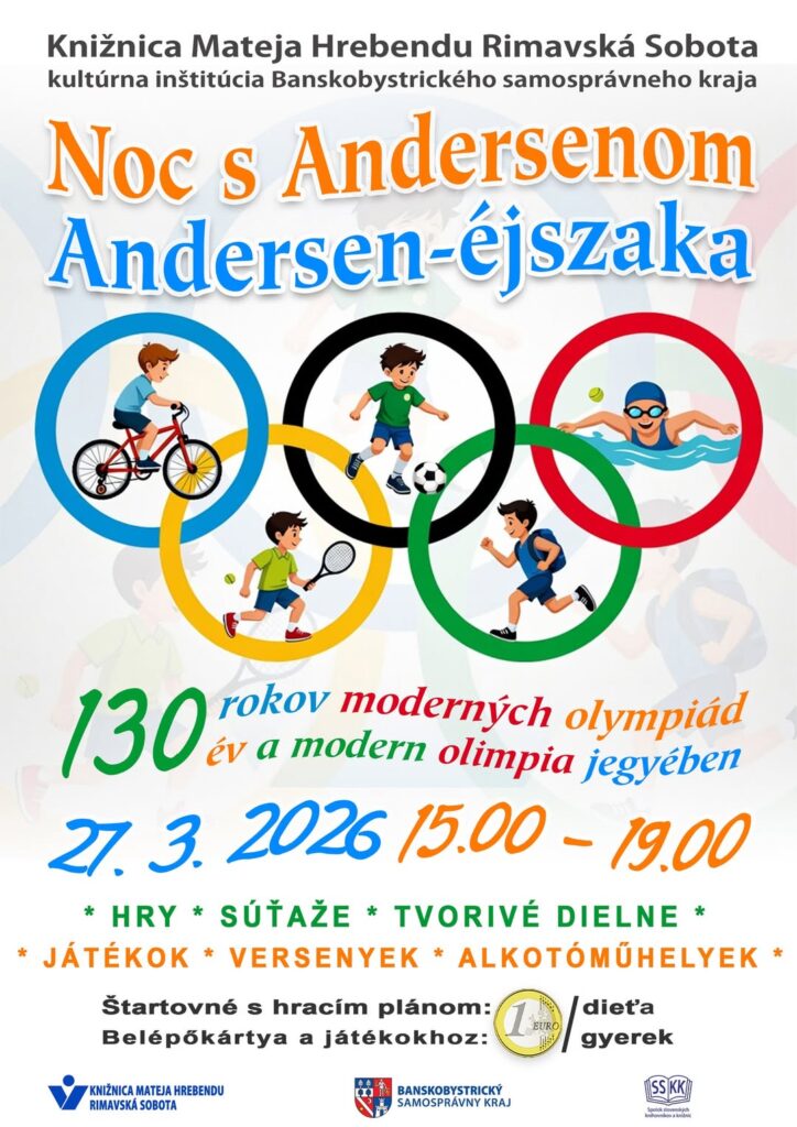 V piatok 27. marca od 15:00 do 19:00 ožije Knižnica Mateja Hrebendu podujatím Noc s Andersenom. Deti čakajú tvorivé dielne, hry, hlavolamy aj aktivity inšpirované olympijskými hrami – tento rok si totiž pripomíname 130 rokov od ich vzniku.