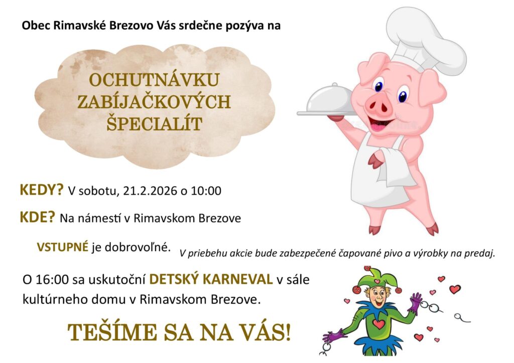 Už od 10:00 hod. budú pripravené klobásy, domáce zabíjačkové pochutiny, kapustnica aj jaternice, pričom vstupné je dobrovoľné a o dobrú náladu bude postarané.