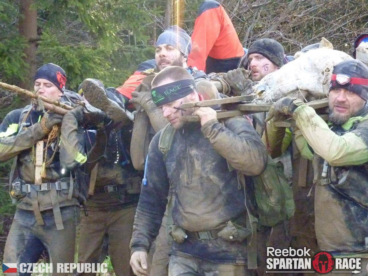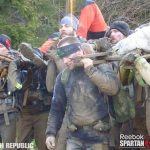 Od vedier sme sa presunuli k vreciam s pieskom, ktoré na trati ostali po sobotňajšom preteku Spartan Super. Tie sme mali presunúť o pár sto metrov vyššie kvôli skráteniu trate na nedeľný Spartan Sprint. Vytvorili sme teda reťaz a začali sme presúvať približne 300 kusov vriec naplnených pieskom. Pri posledných kusoch nám jeden z trojice drilmastrov hovorí, že išlo o vtip a vrecia máme vrátiť späť. Hovorím si, však prečo nie, treba troška srandy 🙂 Raz to je sranda, no keď vrecia presúvate už po tretí raz, tak zo smiechu sa stáva zúfalý smiech. Ale ako sa hovorí: „Čo ťa nezabije, to ťa posilní.“ Vraciame sa pre svoje batohy a opäť vyrážame do kopcov, keďže v Koutoch niet žiadnej rovinky. Dostávame sa ku prekážke „šplh na lane“. Tú musel zvládnuť každý z tímu. A kto nie, členovia tímu museli pomôcť, ale zazvoniť na zvonec musel ten dotyčný. Toto sa stalo v našom tíme, tak sme vytvorili pyramídu, po ktorej vyliezol ten člen tímu, ktorý by to už sám nezvládol. Vraciame sa k batohom, vyberáme si lepiacu pásku a zápalky. Od drilmastrov dostávame čajové sviečky. Ďalšou úlohou bolo plazenie sa pod ostnatým drôtom. Je to celkom ľahká prekážka na pretekoch, no nie na Hurricane Heat. Lepiacou páskou sme si museli zviazať členky a so zapálenou sviečkou sa preplaziť až na druhý koniec ostnatého drôtu. Komu sviečka zhasla, musel zastať a zapáliť si ju.