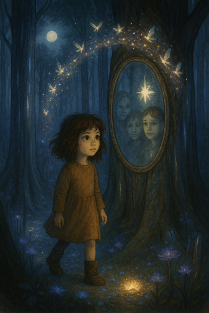 Zvuk bol jemný a tichučký, prichádzal z lesa, o ktorom staré mamy vravievali, že tam nikto nechodí. Nazývali ho Zrkadlový les – miesto, kde stromy ukazujú pravdu. Kto doň vošiel so zlým úmyslom a skazeným srdcom, vyšiel iný. Ak vôbec vyšiel. Ema pocítila, ako sa jej niečo rozlieva v hrudi. Strach to nebol. Skôr zvláštna zvedavosť a pocit, že niekto konečne volá jej meno nie preto, aby sa smial. Pred jej očami sa zjavila úzka, strieborná cestička, akoby vyšitá z mesačného svetla.