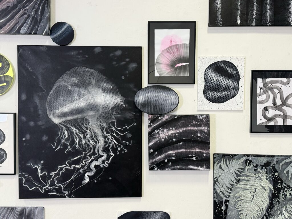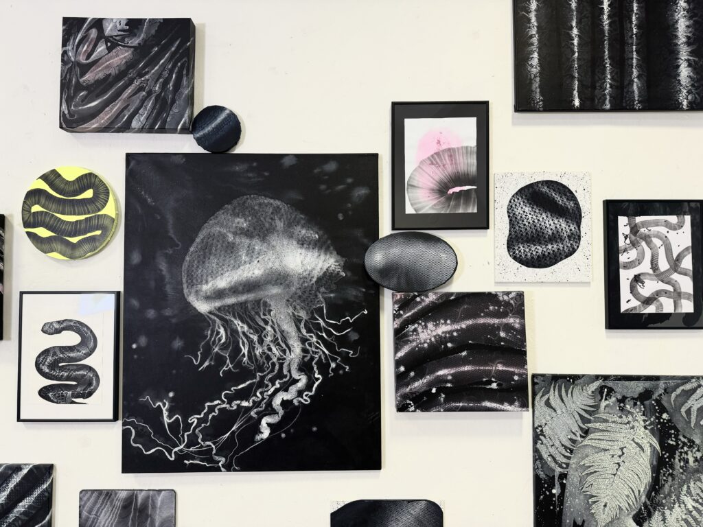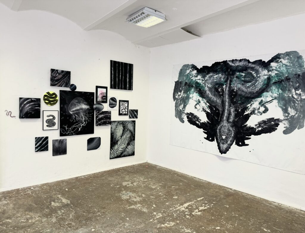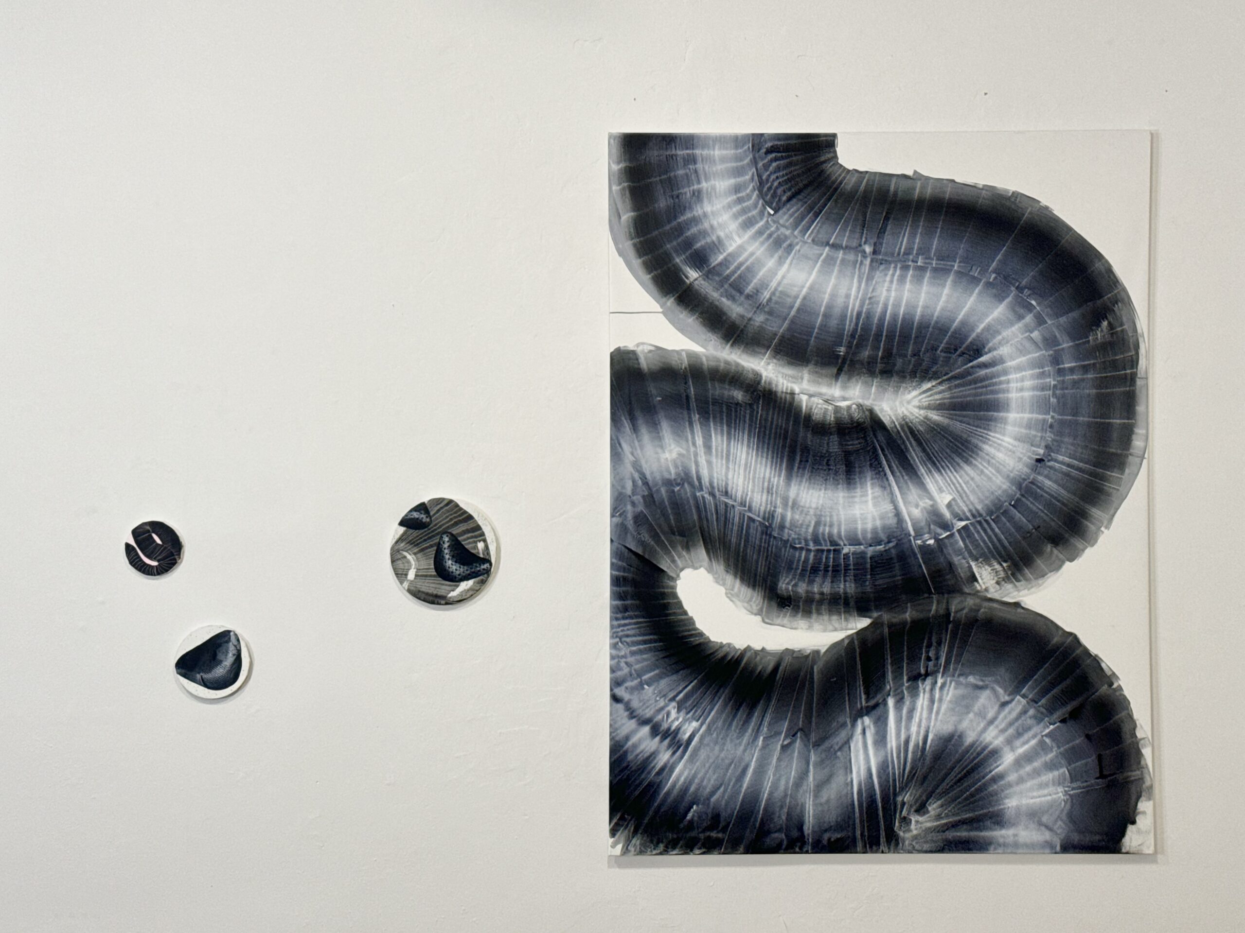 Zaujímavým aspektom výstavy je aj voľba formátov. Lucia sa neobmedzuje len na tradičné rektangulárne plátna, ale zahrňuje aj kruhové a oválne maľby, čím ešte viac posilňuje pocit dynamiky a fluidity. Modifikované hrúbky rámov vytvárajú efekt prelínania sa medzi maľbou a objektom, čo podčiarkuje interaktívny charakter jej práce.