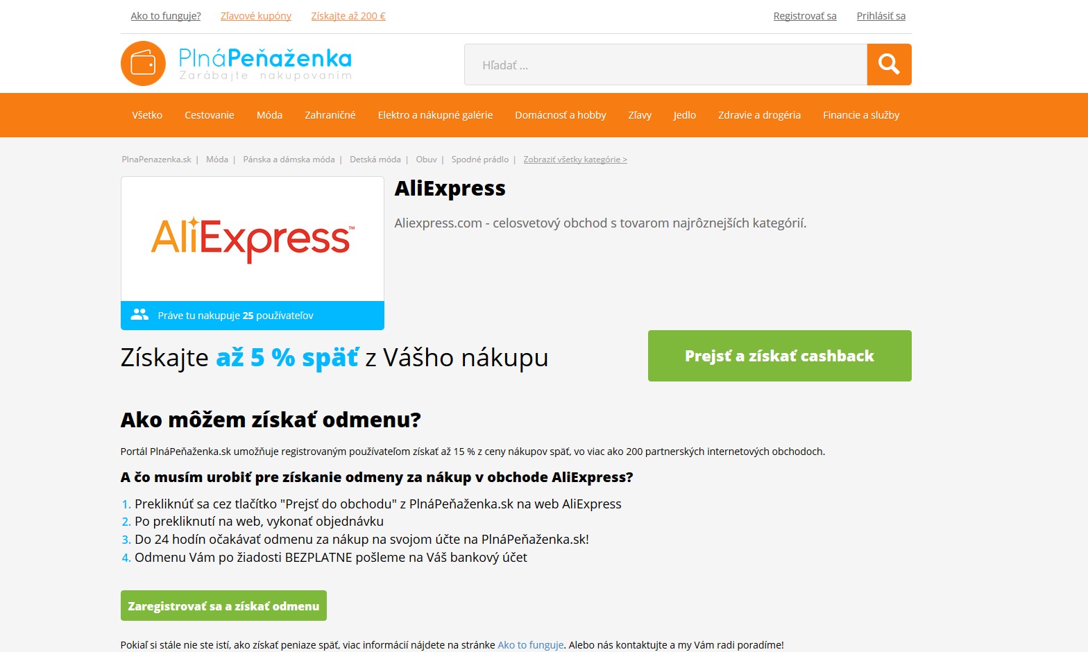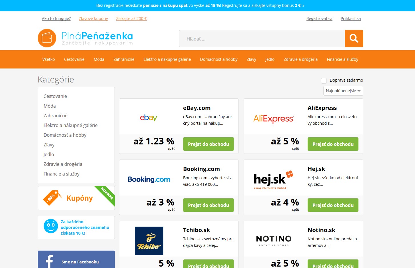 Obchody si viete vybrať zo zoznamu s niekoľkými možnosťami filtrácie (nové, obľúbené, abecedne), alebo podľa kategórií obchodov. Po kliknutí na obchod sa objavia podrobnejšie informácie o obchode, o výške a podmienkach získania cashback, ako aj doplňujúce ponuky, ako napríklad zľavový kupón do daného obchodu. Kliknutím na oranžové tlačítko "Získať X% z nákupu späť" budete presmerovaný do obchodu.