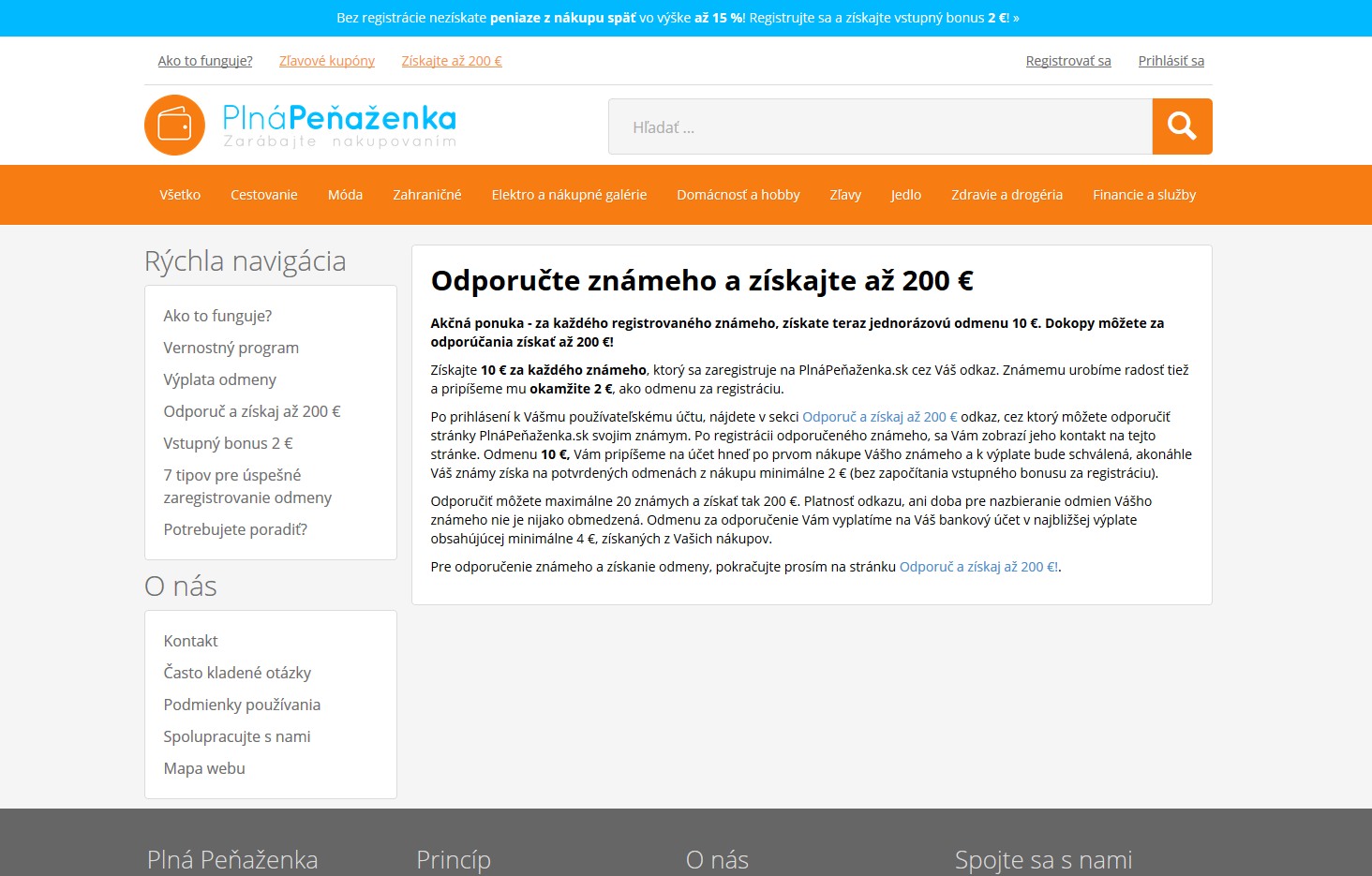 Plnapenazenka má podobný systém ako Tipli. 10 EUR za doporučenie a 2 EUR pre doporučeného. Vašich 10 EUR pripíšu ak odporučený prvýkrát nakúpi a schvália keď získa aspoň 2 EUR cashback na nákupoch. Limit je 200 EUR, teda 20 aktívnych odporučení.