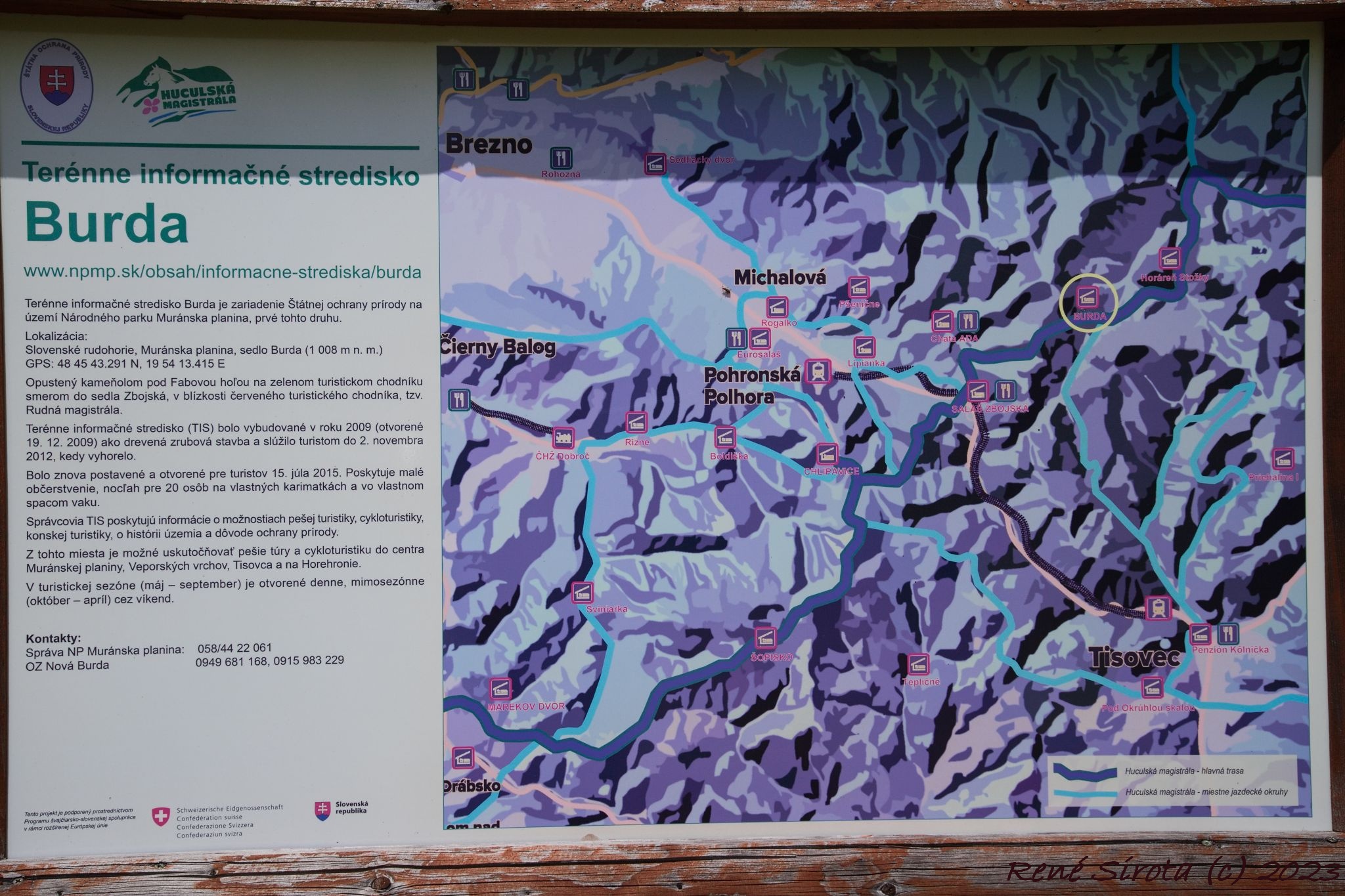 Trasa začína v meste Tisovec a pokračuje popri toku Rimavy k rázcestiu Kačkava. Ďalej už ideme značenou cyklomagistrálou Liptov – Horehronie – Gemer, dolinou Roveň do sedla Burda. Je to rázcestie viacerých značených turistických, cykloturistických lokalít a taktiež konskej turistickej (vedie odtiaľto huculská magistrála).