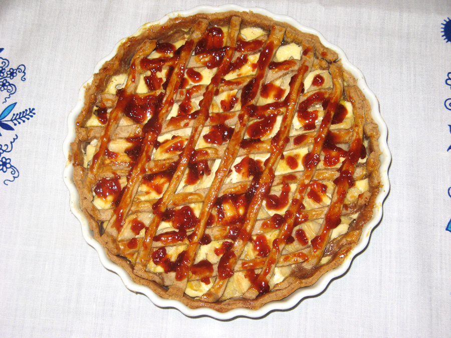 - zvyšné cesto vyvaľkám, nakrájam na pásiky a poukladám ich navrch koláča v tvare mriežky