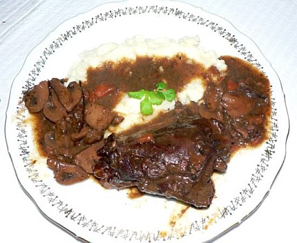 - Hotové mäso položte na tanier. Hustú omáčku aj s hríbmi a ostatnými prísadami nalejte na mäso aj okolo nej. Priložte zvyšok slaniny. Servírujte s varenými zemiakmi alebo s čerstvou, maslom a cesnakom natretou bagetou.