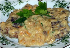 - Keď je mäso už mäkké, znova ho vyberieme z panvice a k omáčke primiešame smotanu, trošku cukru, citrónovej štavy, horčice a kapri. Trošku ju prevaríme, aby zhustla.
