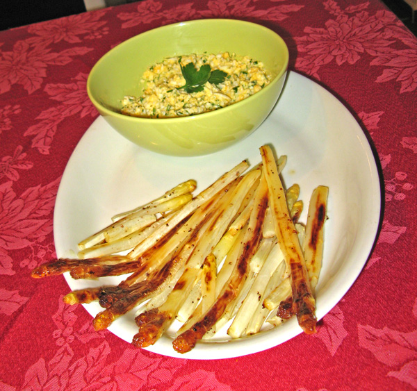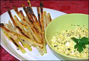 Špargľová sezóna je síce ešte pred nami, ale aspoň s týmto receptom prídeme včas pre vás, milovníkov tejto módnej zeleniny. Ja som špargľu doteraz zjedol len vtedy, ak bola zabalená do anglickej slaniny, aj vtedy len kvôli slanine 🙂 . Ale moja polovička, ona patrí medzi vás... teda tých milovníkov. Minule prekvapila touto pečenou špargľou kombinovanou s krémom zo 7-minutových varených vajec. Karamelovo-slaná špargľová chuť upečenej špargle dáva celkom zaujímavú príchuť, ktorá sa výborne hodí k citrónovo-vaječnému krému. Priznávam, s krajcom čerstvo upečenej hrianky to bolo chutné a celkom výdatné jedlo.