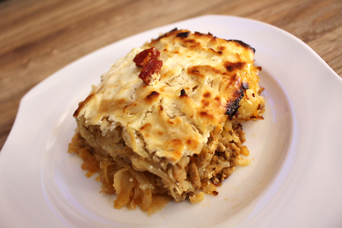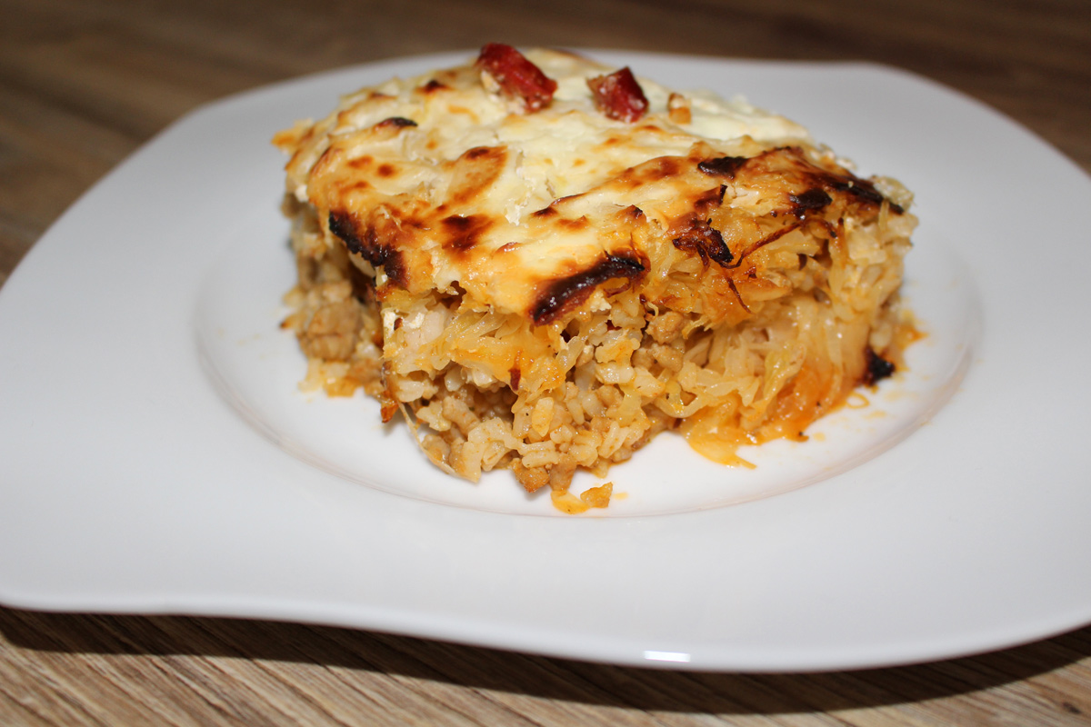 Keď sú tieto časti – prísady jedla pripravené, vyberieme zapekaciu misu, ktorú vymastíme a začneme navrstvením jednotlivých prísad. Dáme prvú vrstvu kapusty, potom mäso s ryžou a zalejeme bielym jogurtom. Potom pokračujeme ďalšou vrstvou kapusty. Na koniec celé natrieme kyslou smotanou.