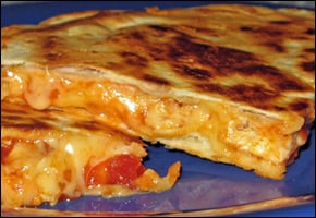Po úspechu chimichangas medzi našimi hosťami sme sa rozhodli vyskúšať aj inú variáciu plnenej tortilly. Tentoraz sme si zvolili rýchle jedlo, ktoré sa volá quesadilla (podľa wikipédie to po španielsky znamená malá syrová vec, čo mi bolo hneď sympatické). Pripadá mi to ako mexická verzia talianskej pizze. Quesadillas sú totiž dve tortilla placky, medzi ktoré sa vloží v prvom rade syr, a následne aj iné ingrediencie, podľa vlastných chúťok. Placky sa potom na panvici prepečú, kým sa syr neroztopí a placky „schrumkavejú“. Výborné, rýchle jedlo, podobne ako pizza guľky sa výborne hodí ako „party jedlo“.