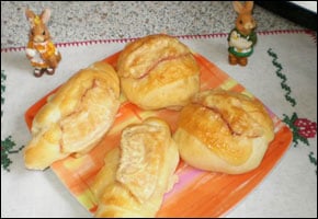- Rozdelíme na dve časti, rozvaľkáme na kruh, radielkom rozkrojíme na 8 častí.